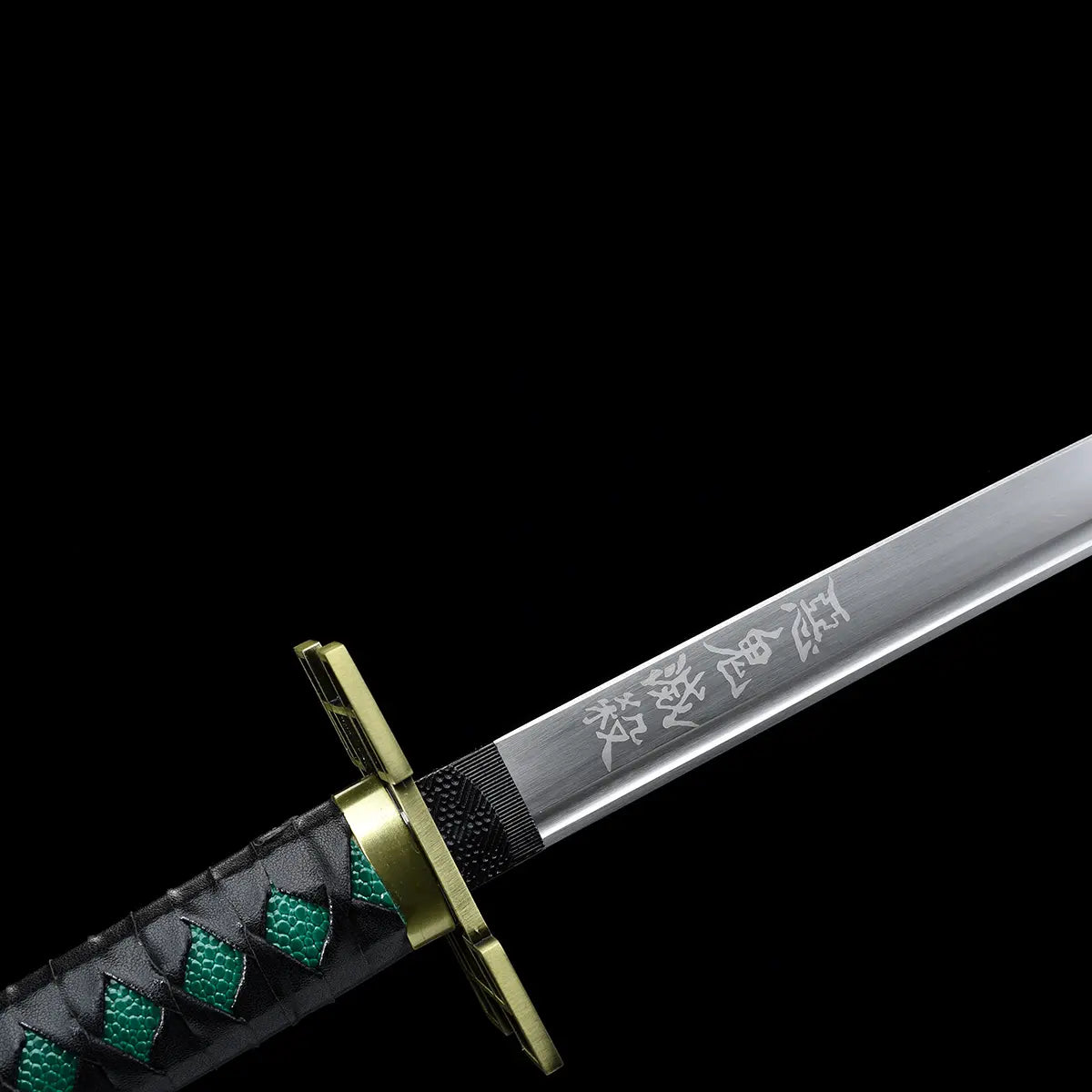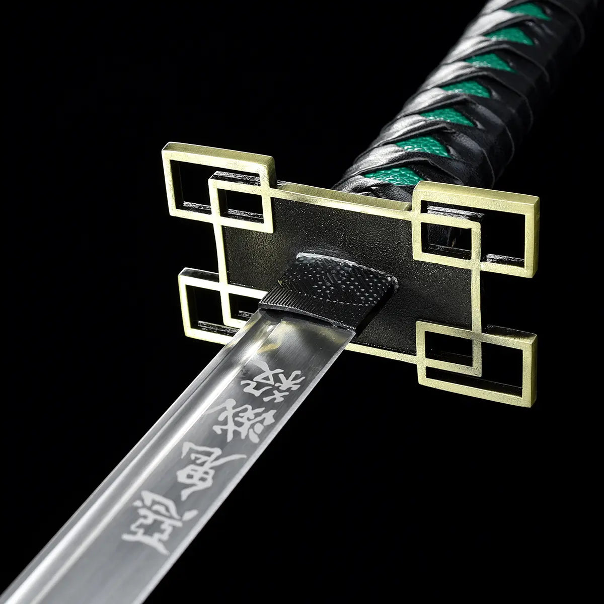 The unique, geometric, gilded zinc tsuba evokes the character's logic and detachment. The black cross-weave reveals green insets on an imitation white stingray skin (same), faithfully reproducing the original style. The blade, made of carbon steel etched with UV printing, reflects the light like a mist of steel ready to slice through the air.
