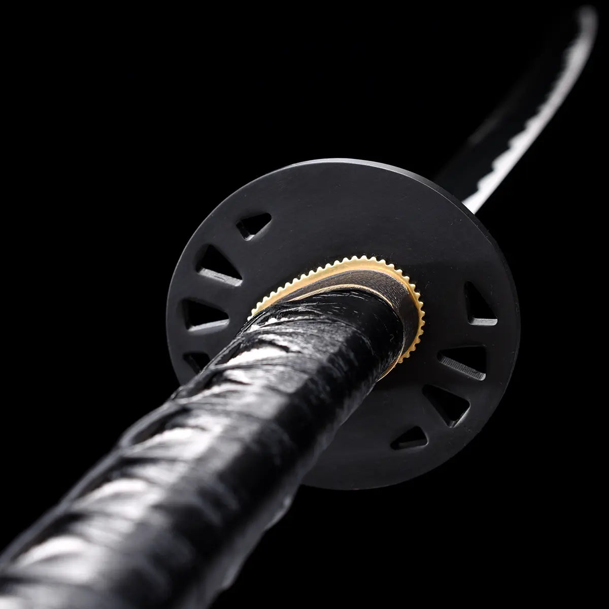 Glossy black lacquered saya adorned with gold patterns, black and white braided tsuka with genuine samegawa, dark steel tsuba and gold habaki.