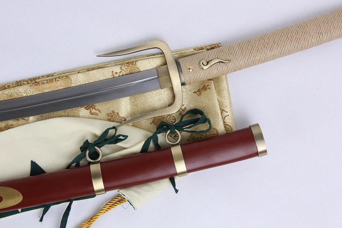 Our replica captures this uncompromisingly rebellious essence . The deep red saya vibrates with its golden patterns , the tsuka exudes authenticity with its natural rope wrapping , and that distinctive guard – that visual signature that makes Mugen's sword unlike any other.