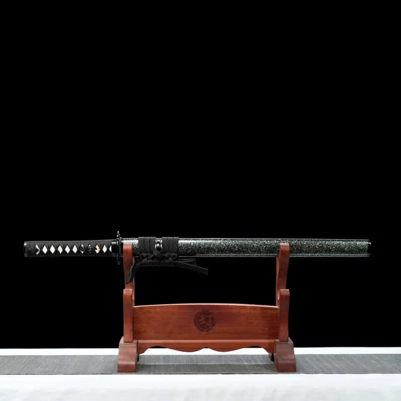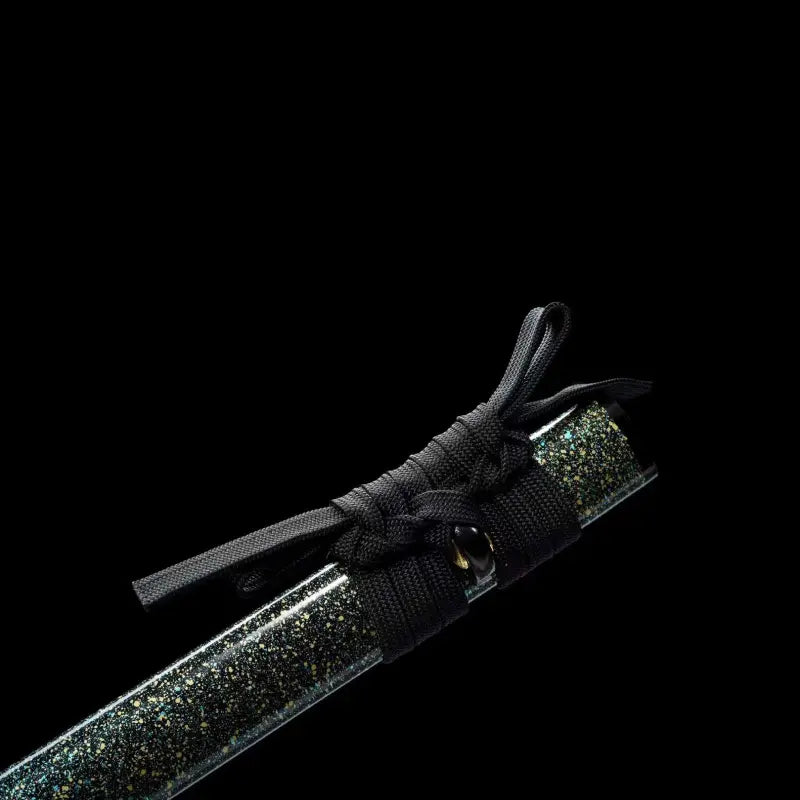 Saya (sheath): Solid hardwood covered in a deep midnight green lacquer with a nashiji effect – this ancient technique inlays fine gold glitter that shimmers like stars scattered across the night sky. The black sageo (carrying cord) of braided cotton completes this refined and mysterious aesthetic.